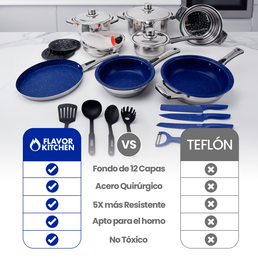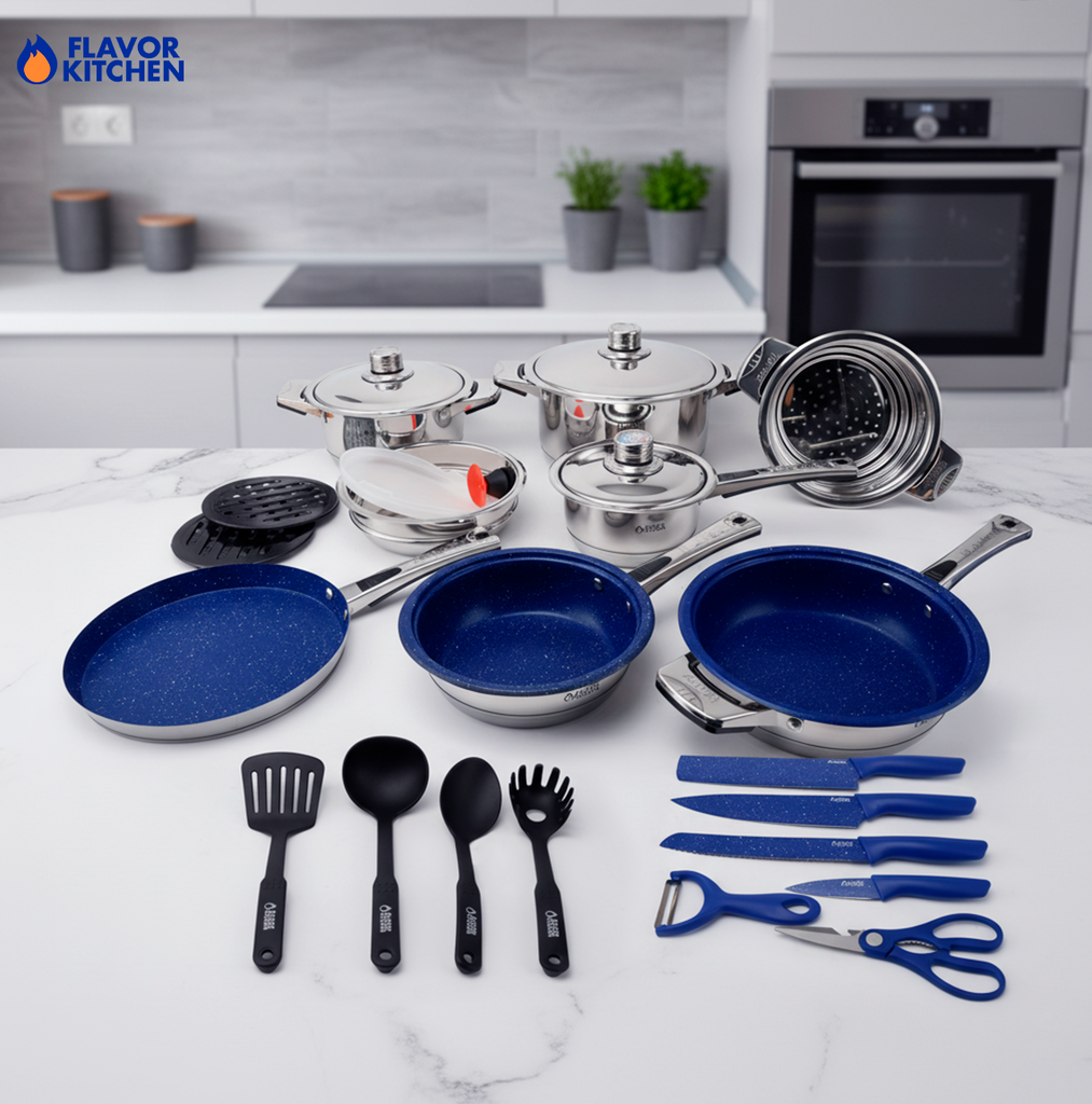 La batería de cocina Flavor Kitchen de 25 piezas ofrece rendimiento profesional en casa, durabilidad real y materiales seguros. Fabricada en acero inoxidable quirúrgico 18/10, resiste la corrosión y el uso intensivo. Su fondo de 12 capas distribuye el calor de forma uniforme, evitando puntos calientes y optimizando el consumo de energía.
